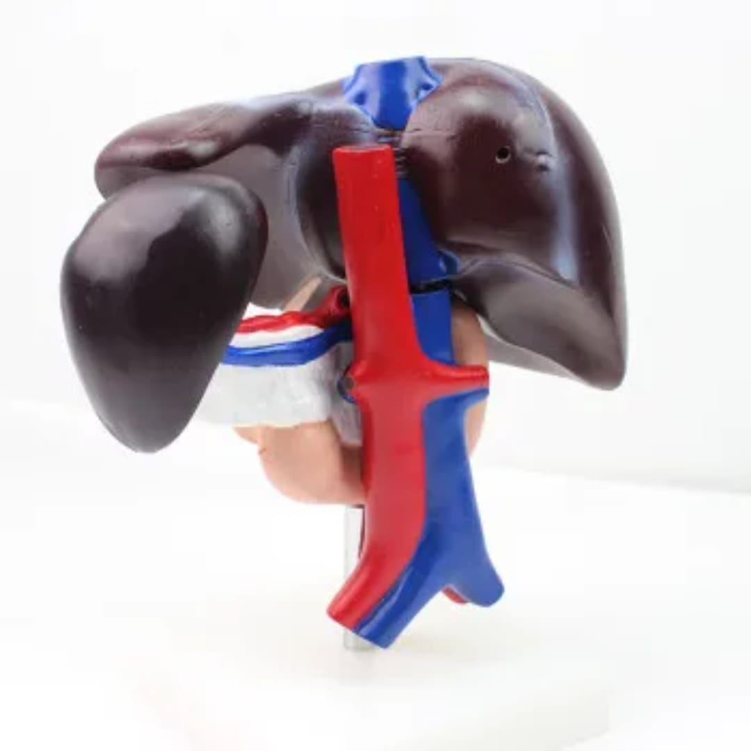 Este modelo muestra el hígado, el bazo, los vasos sanguíneos y el páncreas. Se ilustran las estructuras externas, así como el conducto pancreático. También se muestran la aorta abdominal y la vena cava inferior. Se puede dividir en 3 partes.