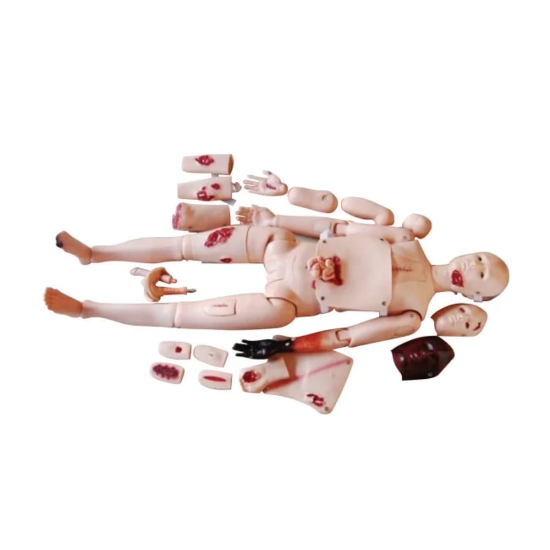 El simulador de trauma avanzado es un maniquí de PVC de cuerpo completo y realista que simula de forma realista a un paciente con trauma. Está diseñado específicamente para la formación de profesionales en el ámbito de la atención de emergencias y el transporte de enfermos y heridos. El simulador consta de 22 módulos. Se puede acoplar a diversas partes del modelo de atención para simular diversos traumatismos físicos, incluyendo quemaduras faciales de 1.º, 2.º y 3.º grado, laceraciones, contusiones, protrusión del intestino delgado, fracturas abiertas, heridas de bala, puñaladas, fracturas de extremidades por cuerpo extraño metálico y otras lesiones.